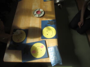 製作では、タンポに絵の具をつけておつきさまにほっぺたをけてあげましたよ♪